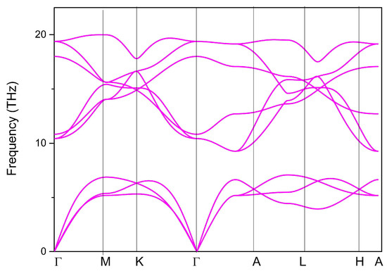 The Phonopy code was used to plot the phonon dispersion curve using the supercell-based approach. A 2 × 2 × 2 supercell was built and the phonon dispersion of the YB2 supercell along the Γ-M-K-Γ-A-L-H-A paths (see Figure 1B) is shown in Figure 2. The absence of imaginary frequencies in the first Brillouin zone confirms its dynamic stability.