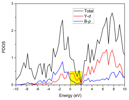 Using the GGA–PBE method, the density of states of YB2 was produced and can be seen in Figure 3. We can see that this material exhibited metallic properties; however, the total density of states value was low, at around 2 eV. The total density of states in the range 0–2 eV was mainly dominated by Y-d orbitals (see the yellow area in Figure 3).