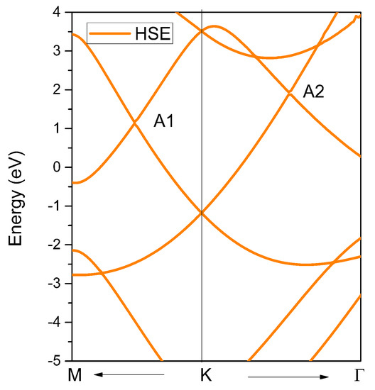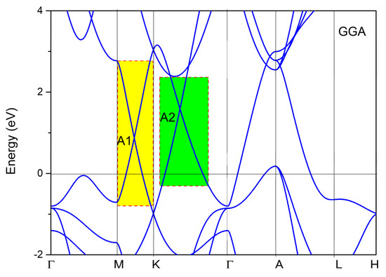 To fully understand the nontrivial band crossing points and the corresponding topological signatures, we also determined the band structure of YB2, as shown in Figure 4. From Figure 4, we can see two obvious band crossing points, named A1 and A2, near the K high symmetry points. Before discussing the topological signatures of both band crossing points, we should point out that the energy range of the linear band dispersion around the A1 and A2 band crossing points was more than 2 eV (see the yellow and green areas in Figure 4). Such a large linear energy range is substantially larger than most other proposed linear-type band dispersion materials [49]. Moreover, such a large linear energy range makes YB2 a promising candidate to study the physics related to experimental band crossings. To obtain an accurate range of the large linear band dispersion and band crossing points of YB2, the hybrid functional [50] was used to calculate the electronic structure along the M-K-Γ paths, and the results are shown in Figure 5. It is clear that the two band crossing points, A1 and A2, and the large range (larger than 2 eV) of the linear band dispersion were retained.