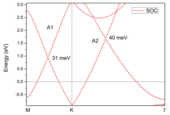 The calculated electronic structures displayed above did not consider the spin–orbit coupling effect. Therefore, as a final consideration, we will discuss the effect of spin–orbit coupling on the band crossing points in the YB2 system. The results are shown in Figure 9; one can see that the spin–orbit coupling-induced gaps for points A1 and A2 were 31 meV and 40 meV, respectively. For almost all topological materials with nodal line states, gaps can be formed between their nodal lines via spin–orbit coupling effects. However, the spin–orbit coupling gaps in the YB2 system were relatively small in comparison to some well-known nodal line semimetals/metals, such as CaTe (~50 meV) [56], BaSn2 (>50 meV) [57], CaAgBi (>80 meV) [58], and TiOs (>100 meV) [59].