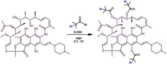 The synthetic route for the modification of rifampicin by introduction of polymer chains in its structure included two steps. Initially, a supramolecular ATRP macroinitiator was synthesized, followed by polymerization of acrylates from the rifampicin-based initiator, forming functional polymer chains. A rifampicin-based macromolecular initiator with bromine atoms (Rif-Br3, Mn = 1269.94, Ð = 1.19) was prepared by an esterification reaction of rifampicin with BriBBr, as shown in Figure 1.