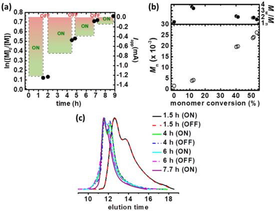 To simplify an electrochemical cell, the current constant conditions were applied to conduct the polymerization of rifampicin-based polymers (Table 1, entry 3). Electrolysis under galvanostatic conditions is privileged from both, laboratory and potential scaling the reaction setup to industrial scale. An electrochemical cell is simplified by the elimination of RE, and a potentiostat/galvanostat can be replaced by a simple direct-current power supply [27,36,52,55]. The current profile was established on the basis of potentiostatic electrolysis as I = Q/t (Q–electric charge, t–polymerization time) (Table 1, entry 2), and consisted of 4 current stages (applied current, Iapp = 1.22 mA, 0.75 mA, 0.39 mA and 0.14 mA, respectively) to appropriately adjust the chronoamperometric curve (Supplementary Figure S10a). Additionally, temporal control over the polymerization was implemented, stopping and restarting the polymerization by switching between ON (Iapp) and OFF (Iapp = 0 A) stages, respectively. This procedure verifies the livingness of the electrochemical-mediated process and provides control over the molecular weight of polymer chains. The observed trend of the first-order kinetics plot (Figure 3a), Mn vs. monomer conversion (Figure 3b) and GPC traces of the samples withdrawn periodically during synthesis, clearly proved the living characteristics of preparative electrolysis, namely while the current value dropped to 0 mA, the polymerization of the monomer and thus an increase of polymer molecular weight was stopped. The temporally control galvanostatic electrolysis provided the final product with broader molecular weight distribution (Mw/Mn = 1.29 vs. 1.59, compare Mw/Mn, Table 1, entries 2 and 3, respectively). Despite the DCFtheo value below 1%, after restarting the polymerization, the chain-and functionality of growing polymers was slightly lost, resulting in the product with higher dispersity comparing to the macromolecules received in the electrolysis under potentiostatic conditions without temporal control stages.