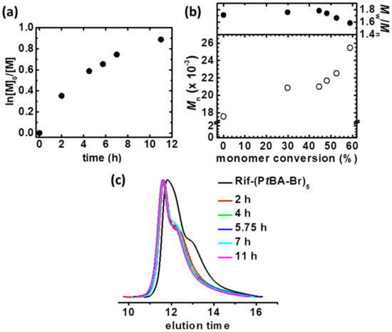 Motivated by better control during the polymerization catalyzed by CuIIBr2/TPMA, tBA as a precursor of polyelectrolytes, was polymerized from rifampicin-based ATRP macroinitiator via seATRP under potentiostatic conditions (Table 1, entry 4, Supplementary Figure S11a,b). Linear characteristics of both first-order kinetics plot (Figure 4a) and an increase of polymer molecular weight as a function of monomer conversion (Figure 4b,c) was observed. However, the final product is characterized by broader molecular weight distribution comparing to Rif-(PnBA-Br)3 (Mw/Mn = 1.71 vs. 1.29, compare Mw/Mn, Table 1, entries 2 and 4, respectively). It is directly connected with the higher macroinitiator concentration in the polymerization of tBA. According to the equation describing the dispersity Mw/Mn = 1 + (kp[P-X]/kda[CuII])(2/p − 1) (where kp is rate constant of propagation, [P-X]–macroinitiator concentration, kda–rate constant of deactivation, [CuII]–copper (II) concentration and p–monomer conversion) [69,70], higher [P-X] provides macromolecules with higher dispersity.
