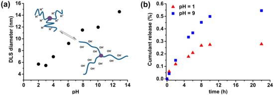 At highly alkaline pH values, when the solution contains high hydroxyl ions concentration, the acid segments of AA units are completely negatively charged. It results in the stretched side chains of rifampicin-based polymers, which shows a maximum in hydrodynamic diameter of 14.59 nm. With the decrease in pH value, the degree of ionization also decreased, causing the coiled conformation of PAA side chains, and hence a smaller DLS diameter is observed. Considering pH responsiveness of prepared rifampicin-based macromolecules with PAA side chains, they could be used as a carrier of active substances to achieve control release in different pH values. Quercetin, a flavonoid with many therapeutic activities, was encapsulated into the rifampicin-based micelles (loading efficiency, EL = 60%) in aqueous solution by a dialysis method, followed by a pH-dependent release process of QC from micelles was investigated by UV-vis spectrometry (Figure 6b). At highly acidic conditions (pH = 1), when PAA segments are coiled, and thus encapsulate the substances, the micelles showed relatively low release level, only reaching 28% of released QC after 22 hours. Meanwhile, in the buffer solution at pH 9, the release rate of QC rapidly increases and finally reached 55% of the QC released from the micelles.