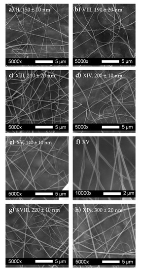 | Run | Qp (mL/h) | Qs (mL/h) | V+ (kV) | V− (kV) | Fiber Diameter (nm) |