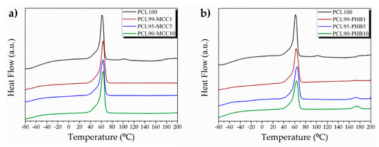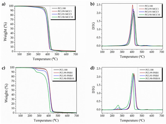 | Formulations | T5% (°C) | TmaxPHB (°C) | TmaxPCL (°C) | TgPCL (°C) | TmPCL (°C) | ΔHmPCL (°C) | TmPHB (°C) | ΔHmPHB (°C) | χc (%) |