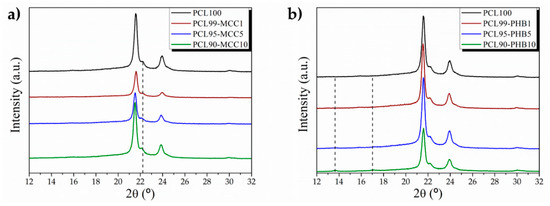 - Garcia-Garcia, D.; Ferri, J.M.; Boronat, T.; Lopez-Martinez, J.; Balart, R. Processing and characterization of binary poly(hydroxybutyrate) (PHB) and poly(caprolactone) (PCL) blends with improved impact properties. Polym. Bull. 2016, 73, 3333–3350. [Google Scholar] [CrossRef]