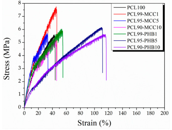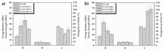 3.2. Electrospun PCL-MCC and PCL-PHB Mats Characterization