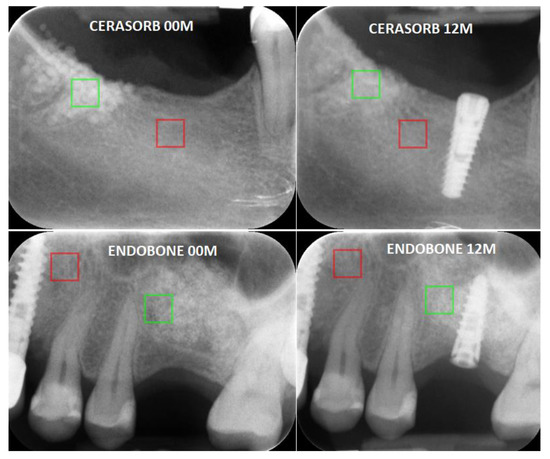 Examples of analysed intraoral radiographs (directly after implantation (00 M) and one year after surgery (12 M)). The exemplary regions of interest (ROI) are marked in green (material ROI) and red (bone ROI).