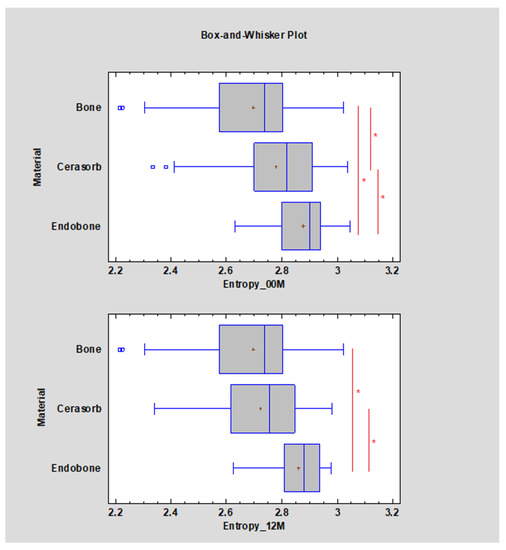 Bone-substitute-dependent alteration of the radiotexture defined by entropy in the implantation site. Observations immediately post-operation (00 M) and 12 months after surgery (12 M). Asterisks indicate statistically significant differences (p < 0.05).