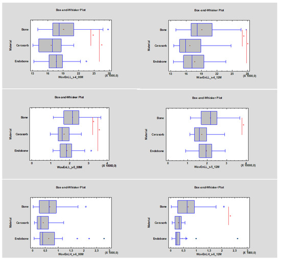 The WavEnLL_s-4 value decreased for both materials during the observation period and became more similar to the bone reference value for Cerasorb. Considering that WavEnLL_s-5 showed that the Cerasorb value was similar to the reference bone value with p < 0.05, the WavEnLH_s-6 value (indicating bone) also became more similar to the value range of the reference bone, ranging between 484.04 and 523.24 after 12 months of the healing process for Cerasorb compared with that for Endobone (Figure 4).