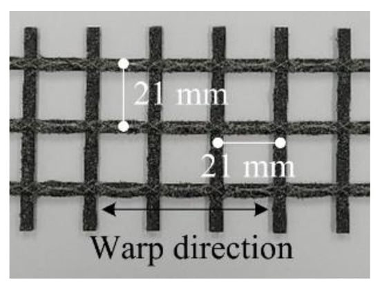 TRC is composed of a matrix to maintain its shape with the textile reinforcement and to form the structural system. The most common textile reinforcement for the flexural strengthening of concrete structures is the two-dimensional grid shape textile [,,,]. In this study, the carbon textile grid (Q85/85-CCE-21, Solidian GmbH, Albstadt, Germany) shown in Figure 1 is employed. The mechanical properties of the textile grid are listed in Table 1. The surface of the textile is coated by quartz sand with grain size of 0.3–0.8 mm to improve the bond strength with concrete [].