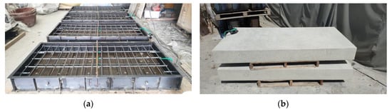 The dimensions of the full-scale RC slabs are 1000 × 200 × 2000 mm3 (width × height × length). As shown in Figure 3, five steel bars and three steel bars with a diameter of 15.9 mm (H16) were arranged respectively at the bottom and top of the slabs, and stirrups with a diameter of 9.53 mm (H10) were arranged for shear reinforcement. The mix composition of ready-mixed concrete used for the fabrication of RC slabs is provided in Table 3. Figure 4a,b depict the completed specimens before and after placing of concrete. The compressive strength measured on a cylinder made of concrete used in the fabrication of the specimens was 33.5 MPa at the age of 30 days.