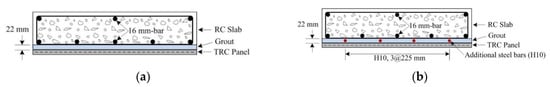 Four of the completed RC slabs were strengthened with TRC panels. For the SP series specimens (Figure 5a) it was assumed that the bottom face of the RC slab had deteriorated and they were strengthened using only a TRC panel and grouting after having been chipped to the surface of the tensile reinforcement. The SSP series specimens (Figure 5b) simulating the need for additional steel reinforcement following assumed degradation of the bottom side and section loss due to steel corrosion were reinforced by additional steel reinforcement. Additional steel reinforcement with a diameter of 9.53 mm (H10) was placed between the concrete substrate and the TRC panel (Figure 5b).
