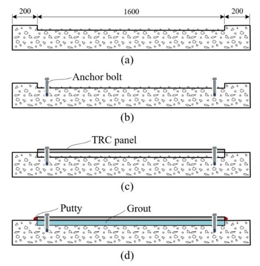 Strengthening process: (a) concrete surface chipping; (b) anchor bolts installation; (c) TRC panel assembling; (d) putty placement and grouting.
