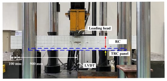 The flexural performance of the specimen strengthened with the precast TRC panel and grout material was evaluated by a three-point bending test, as shown in Figure 8. Two LVDTs (CASKOREA, Seoul, Korea) were installed along the centerline at the bottom of the slab and loading was applied using a UTM with a capacity of 2000 kN (Daekyung, Seoul, Korea) through displacement control at a speed of 1 mm/min.