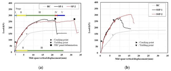 Sets of two specimens were fabricated and tested for each SP and SSP series. Some difference can be observed for the peak load but the behavior and response until the peak load are practically identical. This similarity indicates that the tests were consistent with each other. In view of the load-displacement behavior of the specimen strengthened with the TRC panel, there is some difference in the responses, but the first and second linear behavioral stages between the initiation of concrete cracks and the rebar yield can be distinguished, similarly to those observed in the control RC slab. The difference occurs in the part from the third stage following the second stage after the rebar yield to the peak load. In this part, the specimens of SP and SSP series exhibit a shorter post-yield ductile section than the RC specimen and show a steep reduction of the load-carrying capacity due to sudden failure (fourth stage). In particular, in Figure 9a, delamination between the TRC panel and the concrete occurred in the SP series to lead to sudden failure. In the final fifth stage, the displacement increased continuously without further resisting of the applied loading.