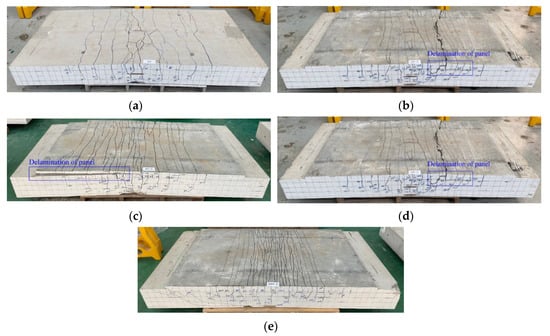 Figure 10 presents the crack patterns of the specimens after completion of the test. The tested specimens were placed in an inverted position to inspect the crack patterns and failure mechanism on the bottom side of the specimens. The RC specimen shows a typical flexural failure mode (Figure 10a). The SP series strengthened with the TRC panel through grout filling exhibited flexural failure and bond failure by delamination of the panel (Figure 10b,c). The SSP series with additional steel reinforcement experienced composite failure mode with the occurrence of failure by the propagation of inclined tensile cracks from the ends of the panel toward the loading point after the initiation of flexural cracking (Figure 10d,e).
