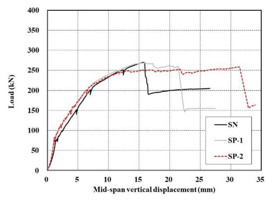 Figure 9 plots the load-displacement curves measured in the bending test of the specimens. The RC specimen (control) exhibits typical behavior of an RC flexural member. The load-displacement curve is quasi-trilinear with a linear part until the initiation of tensile cracks in concrete as the first stage, a load resisting part until the yield of steel reinforcement of unstrengthened cross section in the second stage (see yielding point in Figure 9), and an increase of the displacement only after yield of the steel reinforcement in the third stage. For both the SP and SSP series specimens, the strain gauges were mounted on the top and bottom reinforcements (16 mm bars, Figure 5) only. Hence, the yielding of reinforcement indicates the yielding of the bottom (tensile) reinforcement (16 mm bar). However, it should be noted that the additional steel reinforcement (10 mm bar) might yield first due to a higher depth relative to the neutral axis.