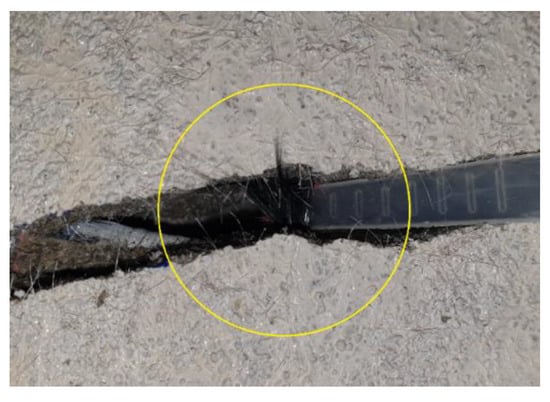 Figure 11 compares the load–displacement curves of the specimen strengthened with the TRC panel and the SN specimen strengthened by a cast-in-place TRC system of KICT []. The SP series and the SN specimen exhibited quasi-similar load resisting performance where the load-carrying capacity develops until the peak load and shows a steep loss after failure to reach a level comparable to that of the yield load of the matrix. It can be clearly seen from Figure 11 that the failure of the SN specimen occurred with a low value of displacement relative to that of the SP series specimens because the tensile strength of the textile used for the SN specimen was approximately 51% of that used for the SP series specimens. However, in view of the post-failure strength, the strengthening with the cast-in-place TRC system exhibits a slightly higher value of 200 kN than that (150 kN) developed by strengthening with TRC panels. Considering that the yield load of the RC slab to be strengthened was around 140 kN (Table 5), the specimen strengthened with a TRC panel faithfully fulfilled its strengthening performance after the final failure. The specimen with the cast-in-place TRC system continued to resist the external force to some extent by transferring it to the remaining fibers even when the specimen partially lost its strengthening performance due to the rupture of a portion of the fibers of the carbon grid (Figure 12). Despite that post-failure is meaningless in terms of the resistance of the structure, this transfer of the external force can be credited to the relatively uniform bonding between the TRC and the slab in the specimen with the cast-in-place TRC system.