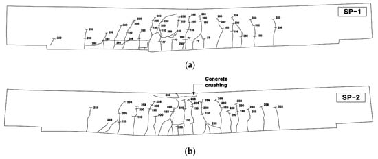 In general, the cracking of the RC flexural member changes from cracking induced by pure bending to cracking caused by the combined action of flexure and shear, as the tensile reinforcement ratio is increased []. As explained above, the effective tensile reinforcement ratio of the SP series and SSP series was increased respectively by 7% and 30% compared to the RC slab. Therefore, the failure induced by the inclined tensile cracks in the SSP series can be attributed to the significantly larger reinforcement ratio provided by both TRC and additional reinforcement. When the RC flexural member features a high reinforcement ratio, failure is likely to occur suddenly due to the inclined tensile cracks. Accordingly, the effective reinforcement ratio and the failure mode must be checked when design is conducted for strengthening with TRC.