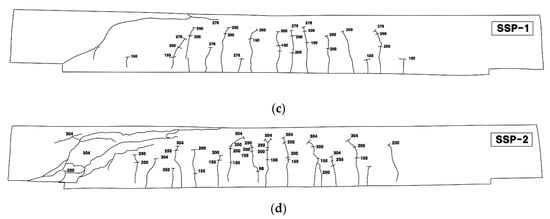 Figure 13 shows the crack patterns viewed from the side of the specimens. The failure induced by the inclined tensile cracks tended to be brittle in some cases. For the SP series in Figure 13a,b, inclined tensile cracks were not visibly observed until failure. In addition, for the SSP series in Figure 13c,d, inclined tensile cracks were observed. For SSP-1 specimens, these cracks were not visible until 250 kN but developed immediately when reaching the peak load of 276 kN. In the case of the SSP-2 specimens, inclined tensile cracks were observed at around 250 kN and developed suddenly when the peak load of 305 kN was reached. The occurrence of inclined tensile cracks in the SSP series was caused by the change of the failure mode from flexure to flexure-shear due to the additional arrangement of reinforcement. Even though the slope of the load-displacement curve is relatively smaller than that of the SN specimen (Figure 9), the failure of the RC slab due to the inclined tensile cracks approximately shows the pattern of brittle failure.