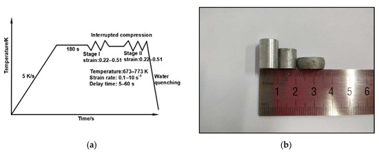 (a) Double-pass hot compression test; (b) the samples before and after the experiment.