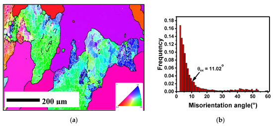 The initial microstructure of the Al 2219 alloy used before the compression test is shown in Figure 2. As presented in Figure 2a, the grain size after SST was relatively large (>200 μm). Furthermore, some grains were densely covered with a large number of sub-structures, while some grains were completely devoid of sub-structures, which indicates that SST could only restore part of the sub-structures, but could not completely eliminate it. Also, small recrystallized grains were still left in the local area. As shown in Figure 2b, LAGB had a proportion of 81.7%, while the average misorientation of the initial state was 11.02°. It can be seen from Figure 2c that some precipitates clustered together and existed as chains in the aluminum matrix. From Figure 2d, the second phase was determined to be CuAl2 (θ) particles using energy disperse spectroscopy (EDS) analysis.