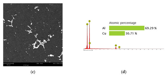 The initial microstructure of the Al 2219 alloy used before the compression test is shown in Figure 2. As presented in Figure 2a, the grain size after SST was relatively large (>200 μm). Furthrmore, some grains were densely covered with a large number of sub-structures, while some grains were completely devoid of sub-structures, which indicates that SST could only restore part of the sub-structures, but could not completely eliminate it. In addition, small recrystallized grains were still left in the local area. As shown in Figure 2b, the LAGB had a proportion of 81.7%, while the average misorientation of the initial state was 11.02°. It can be seen from Figure 2c that some precipitates clustered together and existed as chains in the aluminum matrix. From Figure 2d, the second phase was determined to be CuAl2 (θ) particles using energy disperse spectroscopy (EDS) analysis.