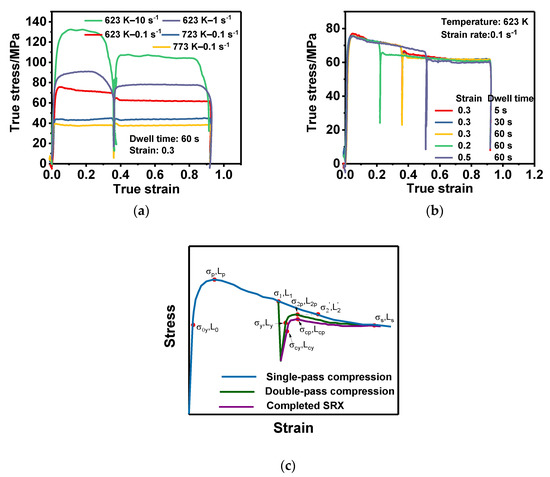 True stress–strain curves under the condition of (a) different temperatures and strain rates at the same dwell time and strain; (b) different dwell times and strains at the same temperature and strain rate; (c) single-pass, double-pass, and completed static recrystallization (SRX) compression.