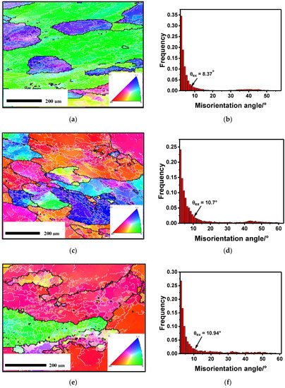 OM and GB figures under the conditions of: (a) 623K–0.1/s–60s–0.36; (c) 723K–0.1/s–60s–0.51; (e) 773K–0.1/s–60s–0.36. Misorientation angle frequency under the conditions of: (b) 623K–0.1/s–60s–0.36; (d) 723K–0.1/s–60s–0.51; (f) 773K–0.1/s–60s–0.36.