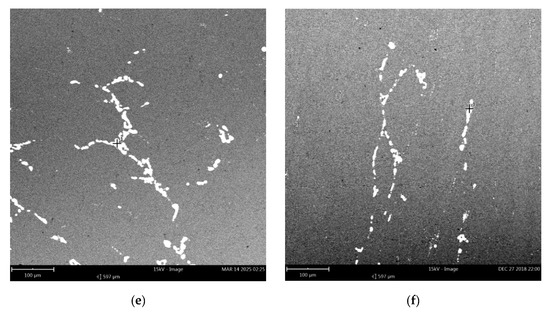 Figure 6 shows the SEM micrographs of the samples under different deformation conditions. It can be seen that the deformation parameters have great influence on the precipitation and evolution of the second phase particles. Figure 6a,b shows the SEM results of the first pass and the second pass with the same deformation parameters, respectively. It can be seen that the total precipitates of the second phase varied slightly with the increase in strain, but the aggregate chain particles were obviously fragmented, indicating that the continuous deformation had a positive effect on the coarse CuAl2 particles fragment. Figure 6b,c shows the evolution of the precipitate particles at different temperatures. It is obvious that the precipitation particles decreased with the increase in temperature. This is because the solubility of copper atoms in the aluminum matrix increased with the increase in temperature, and many copper atoms redissolved into the aluminum matrix, resulting in a decrease of precipitation particles. Figure 6c,d shows the precipitation phase at different insulation times. It can be seen that the overall change was not obvious, indicating that the static process had little influence on the precipitation of CuAl2 particles when the other conditions remained unchanged. Figure 6e,f shows the morphologies of the precipitated particles at different strain rates. It can be seen that the amount of precipitated particles was similar, and the size of the CuAl2 particles decreased slightly at a high strain rate, indicating that the high strain rate was conducive to the fragmentation of precipitated particles.