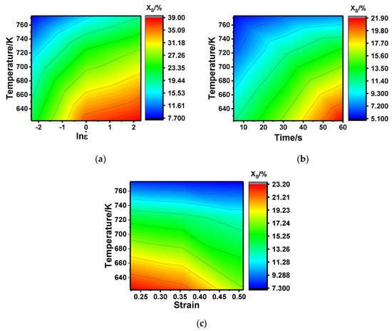 Static recrystallization fraction under the deformation condition of different temperatures and (a), (b) time, and (c) strain.