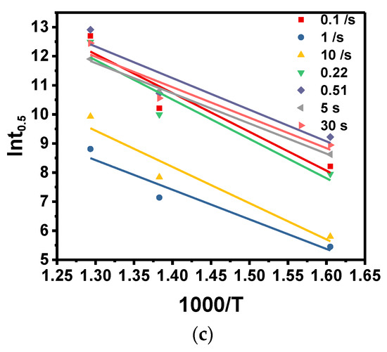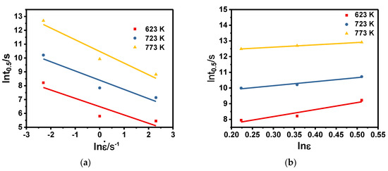 The relationship between lnt0.5 and lnέ, lnε, and 1/T are shown in Figure 9. Using linear regression, the values of b, c, Qm can be obtained by the average slope, and the results are shown in Table 2. The value of ln a can be obtained by substituting the obtained values into Equation (12).