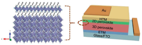 Not only to remedy these instabilities, but also to enhance the performance, diverse attempts have been made, such as compositional engineering using mixed-cations and -halides [11,12,13] and the employment of an interlayer between the perovskite and selective contacts [14,15,16]. Meanwhile, 2D perovskite, where bulky cations invade 3D perovskite and slice the lattice parallel to the substrate, has attracted attention owing to its superior moisture resistance due to the hydrophobicity of spacer cations [17,18]. Mohite et al. developed the quasi-2D perovskite system based on methyl ammonium iodide (MAI) and butyl ammonium iodide (BAI), leading to (BA)2(MA)2Pb3I10 and (BA)2(MA)3Pb4I13, which showed considerably improved light- and moisture-stabilities compared to 3D perovskite (MAPbI3) [19]. In spite of the notable stability enhancement, the power conversion efficiency (PCE) of PSCs based on quasi-2D perovskite is generally lower than that of 3D-based PSCs [18,19,20], which is attributed to the inferior optoelectronic properties of 2D perovskite, and similarly to the insulating characteristics [19,21]. The limitation of 2D or quasi-2D perovskite was recently resolved by introducing 3D/2D hybrid perovskite, where each advantage of 3D and 2D perovskite was comprehensively employed to ensure a superb performance in terms of both the stability and PCE [22,23]. In 2016, Shi et al. conceived the hybrid structure, as illustrated in Figure 1, where an extremely thin 2D layer is deposited on the top of the 3D bulk film, leading to a remarkable moisture stability and a PCE of 13.86% with an increased open-circuit voltage (VOC) [24]. The promising results encouraged the 3D/2D hybrid perovskite system to be intensively explored with many different bulky cations in a variety of forms [25,26,27], which is now regarded as an effective strategy for assuring the stability without compromising on the photovoltaic performance [27].