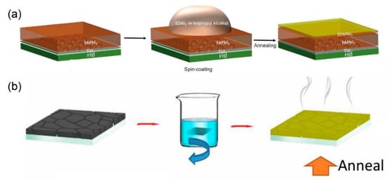 The in-situ growth of 2D perovskite is the most widely used process for forming the 3D/2D bilayered perovskite structure, since it is easily implemented by a few additional steps after routine preparation of the 3D bulk film. Figure 2 shows a schematic experimental process of the in-situ growth of a 2D capping layer, which can be adapted with either spinning (Figure 2a) or dipping (Figure 2b) to form a 2D thin layer on top of a 3D perovskite film [25,29]. Organic salt, composed of bulky organic cations and counter halide (see Section 4. Organic salt for 2D perovskite for details), is dissolved in isopropyl alcohol (IPA) [24,25,26,28,29,30,31,32,33,34,35,36,37,38,39,40,41] or chlorobenzene (CB) [36,42] and dripped on the surface of a spinning 3D perovskite film, whose excess PbI2 readily reacts with the organic salt, leading to the formation of a 2D capping layer on the surface during the post annealing process (Figure 2a). Alternatively, an immersion of the 3D perovskite film in the IPA solution containing the organic salt for 2D can be adopted, instead of dripping the solution, in order to induce the 2D capping layer (Figure 2b) [25]. The thickness of the 2D layer can be controlled by the concentration of the solution containing the organic salt [24]. It has been found that additional flash annealing of the 3D perovskite film at a high temperature facilitates the formation of the 2D perovskite layer by exposing the Pb-I framework of the 3D structure. For flash annealing, MAPbI3 bulk film is reversely placed on a hot plate with a gap of 3 mm at 300 °C for less than 10 s to release MAI on the surface. The exposed Pb-I framework is reacted with 5-aminovaleric acid iodide (AVAI), resulting in (AVA)2PbI4 with an improved interface [26]. The in-situ growth method for the 2D capping layer can be further extended to form double 2D passivation layers on the top and bottom of the 3D perovskite film [41].