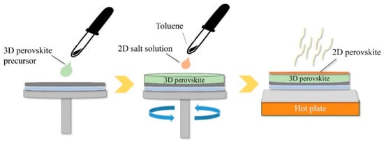 The anti-solvent method has been well-established as a conventional recipe for obtaining a high-quality 3D perovskite film [43]. The anti-solvent (e.g., CB, toluene, etc.) is employed as a second solvent to induce quick nucleation for fast crystallization of the 3D film [43]. When the anti-solvent is used as a solvent for the 2D organic salt, the in-situ 2D growth method can be practically combined with the conventional anti-solvent method, as illustrated in Figure 3. The anti-solvent containing the organic salt for 2D is directly dripped on the spinning substrate, which is wet with a precursor solution of the 3D perovskite. The dripping process of the anti-solvent is followed by a one-step annealing process to form both 3D and 2D perovskite layers at the same time. Toluene containing phenylethylammonium iodide (PEAI) was used as the anti-solvent for a 3D/2D bilayered perovskite structure [44]. A successful deposition of the 2D capping layer was subsequently verified by the time-of-flight secondary ion mass spectroscopy (TOF-SIMS) depth profile, where the PEA cation for the 2D capping layer was monitored across the 3D film by the anti-solvent method, but specifically concentrated near the surface with a sharp increase in the intensity, indicating the formation of a 2D thin layer on the surface.