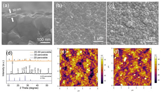 When a 3D/2D bilayered structure is formed, the morphology of the resultant heterostructure is considerably distinguished from that of a single 3D or 2D structure. The scanning electron microscope (SEM) images in Figure 4a–c represent the morphology change caused by the in-situ growth of the 2D perovskite (PEA2PbI4) layer on the 3D (α-FAPbI3) film. Figure 4a shows the cross-sectional morphology of 3D/2D bilayered structures where a 30 nm-thick 2D capping layer (generally ranging from 9 mm [25] to 100 nm [31]) is grown on the surface of the 3D bulk film. Figure 4b shows a surface image of the compact 3D film, where the white flake at grain boundaries indicates the excess PbI2 exposed on the 3D surface [24,29,37,39]. On the other hand, a distinctive surface morphology is observed by the in-situ-grown 2D capping layer, which fully covers the 3D film (Figure 4c). It is notable that the PbI2 flake on the 3D surface disappears in the 3D/2D bilayered structure due to the reaction with salts during the in-situ growth of the 2D capping layer [24,28,29,37,39]. XRD patterns also ensure a reaction between the excess PbI2 of the α-FAPbI3 film with permeated PEAI salts during the in-situ growth (Figure 4d), showing a negligible PbI2 peak at 12.7° in the 3D/2D bilayered structure. Accordingly, the 3D/2D bilayered structure displays hybrid patterns dominantly governed by the 3D α-FAPbI3 bulk film, with weak patterns for the 2D PEA2PbI4 capping layer. Importantly, the improved surface morphology with a reduced roughness is one of the general features observed from the 3D/2D bilayered structure [24,25,26,36,39]. Figure 4e,f show atomic force microscope (AFM) images of the 3D and 3D/2D bilayered structure, respectively. The formation of the 2D capping layer results in a smoother surface with a root-mean square (RMS) of 17.8 nm, while the 3D film demonstrates an RMS of 20.8 nm.