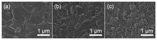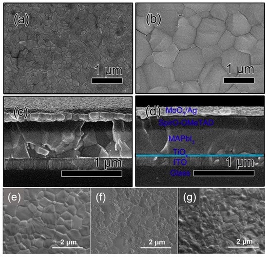 Furthermore, the morphology change is highly dependent on the precursor source used for the 2D layer. While the precursor employed for the 2D layer is mostly adopted as a form of iodide or amine species, diethylammonium bromide (DABr) was introduced as a salt for the in-situ growth of the 2D layer [30]. Post-treatment with DABr not only formed a 2D capping layer, but also induced a secondary growth of the 3D film. Figure 6a,c present the surface and cross-sectional SEM images of the pristine 3D bulk film. Growth of the 2D layer was observed when using 3 mg/mL of DABr solution, which evolved into Ostwald ripening of the underlying 3D MAPbI3 film when increasing the concentration of DABr solution. An apparent increase in grain size can be observed in Figure 6b for when Br− was incorporated by using 5 mg/mL DABr solution. A cross-sectional image of the 3D/2D bilayered structure based on 5 mg/mL DABr shown in Figure 6d confirms that post-treatment with DABr considerably enhanced the crystallinity of the underlying 3D MAPbI3 film, as evidenced by the increased grain size. On the other hand, a different tendency of the 2D capping layer can be observed with respect to the precursor source containing the same organic species. n-butylamine (n-BA) and n-BAI were used as precursors for the 2D layer, where BA and BAI were dissolved in CB and IPA, respectively [36]. Figure 6e shows the conventional surface morphology of the pristine 3D bulk layer. The post-solution treatment with BA (Figure 6f) and BAI (Figure 6e) considerably altered the pristine morphology due to the formation a 2D capping layer, as proposed in the following equations [36]: