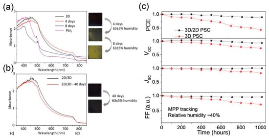 Under high humidity of 63 ± 5% in ambient air at room temperature (RT), the pristine 3D perovskite film easily turned yellow, with decreased absorbance at the perovskite absorption window (ca. 400–770 nm), which is indicative of the decomposition of the 3D perovskite structure leaving yellow PbI2 (Figure 7a) [24]. It is notable that the absorbance peak corresponding to PbI2 (~540 nm, denoted as *) was obviously shown after 8 days for full degradation of the 3D structure, while the 3D/2D bilayered structure retained a black phase without any development of the PbI2 peak at ~540 nm, even after 40 days under the same condition (Figure 7b) [24]. The robust 3D/2D bilayered structure also affects the device stability, leading to a remarkably improved long-term stability. In inert atmosphere (Ar), a PSC based on 3D/2D maintained 90% of the initial PCE after 32 days, while the one with 3D retained 67% of the initial PCE [26]. Furthermore, the shelf stability of PSCs is also highly dependent on the inclusion of a 2D capping layer. The 3D/2D bilayered-based device, stored in the dark with humidity (RH > 50%), retained 86% of the initial PCE for 100 h, while the 3D-based one dropped to 61% of the initial PCE due to overall decreases in every photovoltaic parameter, including short-circuit photocurrent density (JSC)), VOC, and fill factor (FF) [31]. Figure 7c shows a remarkable effect of the 3D/fluorinated-2D bilayered structure in a harsh condition, where the devices were exposed to 1 sun illumination with a relative humidity (RH) of around 40% and kept at the maximum power point (bias voltage stress) during the measurements. In total, 90% of the initial PCE of the 3D/2D-based device was noticeably maintained for 1000 h, even in the intensified stress environments with consistent photon-, moisture- and voltage-bias.