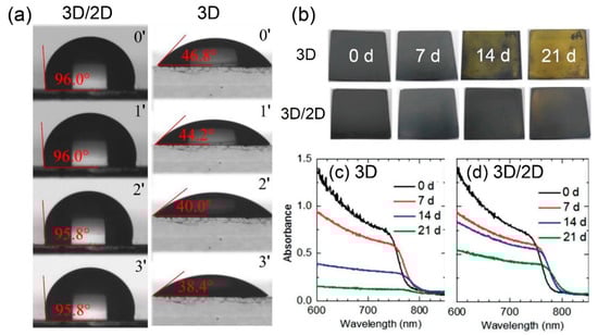 Moisture is one of the major causes of the degradation of 3D perovskite. H2O diffuses into 3D bulk film with a low hydrophobicity, consequently leading to a hydrate form, which is photo-inactive [58,59]. 2D perovskite, however, exhibits a superior hydrophobicity, since large aliphatic or aromatic cations are employed [18,57]. Therefore, 3D/2D bilayered perovskite exhibits a great moisture stability by adopting the hydrophobic surface of the 2D capping layer and thus effectively blocks the permeation of water. Figure 8a represents contact angles of water droplets on the surface of a 3D/2D bilayered structure and pristine 3D as a function of the droplet loading time. The 3D/2D bilayered perovskite resulted in a much higher contact angle of 96.0°, compared to 46.8° for the pristine 3D film. While the contact angle of the 3D film gradually decreased when increasing the loading time, that of the 3D/2D bilayered structure was mostly maintained, indicating greatly improved moisture tolerance by the 2D capping layer [25]. As expected from the contact angle experiments, the 3D/2D bilayered structure effectively protects the underlying 3D perovskite. Figure 8b–d indicate the moisture resistance of perovskite films in a closed vessel with RH of 85 ± 10% at RT. The black 3D film turned yellow after 14 days, which was considerably retarded in the 3D/2D bilayered structure (Figure 8b). The observed tendency was confirmed by absorbance spectra, where a rapid decrease in the absorbance of 3D film (Figure 8c) was delayed in the 3D/2D structure owing to the presence of a 2D layer on the 3D film (Figure 8d). An XRD study also verified the high moisture tolerance of 3D/2D perovskite films [32]. When 3D film was kept under RH of 80%, decomposition of the PSC led to the appearance of new XRD peaks at 28.45° corresponding to PbO, 8.35° and 10.31° for (CH3NH3)PbI3∙H2O, and 39.36° for AgI [44]. Meanwhile, the 3D/2D-based PSC remained stable, without new peaks, demonstrating that the hydrophobic terminals of the 2D capping layer effectively blocked H2O invasion.