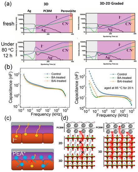 The decomposition of a 3D perovskite structure is usually expected under constant thermal stress, which triggers ion migration and makes the escaped ions diffuse towards the top electrode, damaging both the hole transport material (HTM) and top electrode [60]. Notably, the 2D capping layer has a great impact on not only the moisture tolerance, but also the thermal stress resistance. The thermal effect on the ion diffusion across the perovskite film was investigated by using the time-of-flight secondary ion mass spectrometry (ToF-SIMS) depth-profile, as shown in Figure 9a. After heating the 3D-based PSC at 80 °C for 12 h, the depth-profile of the iodide was notably different from the fresh sample, indicating the pronounced iodide intensity (about 100 times greater) at the interface between the Ag electrode and PCBM [44]. The iodide diffusion toward the interface imposes the high possibility of the formation of AgI and thus implies degradation of the 3D film [60]. On the other hand, BAI-treated 3D/2D-based PSC showed a negligible difference in the iodide depth-profile, regardless of heat treatment. In addition, the increased capacitance in the low-frequency regime was observed for the 3D device after being heated for 20 h at 85 °C, which was ascribed to ion migration by thermal stress [61,62], while the 3D/2D-based device suppressed the increase in capacitance at a low frequency (Figure 9b) [36]. As illustrated in Figure 9c, thermal-induced ion migration, iodide in particular, toward the top electrode is effectively suppressed by bulky cations for the 2D layer, such as BA and PEA [44]. Besides, it has been reported that MA vacancies and the high density of iodine derived from MA volatilization are major causes of the degradation of 3D perovskite [60]. The volatilization of MA is inhibited in the 3D/2D bilayered structure due to the presence of a bulky cation in the 2D capping layer, which not only acts as a barrier to prevent the ion migration, but also makes it difficult for the bulky cation to replace the MA/FA vacancy due to the size difference (Figure 9d) [36].