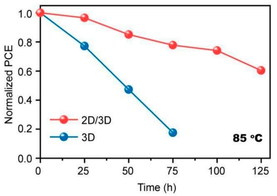 Figure 10 shows the normalized PCE of devices at 85 °C [45]. The device based on a 3D/2D bilayered structure apparently demonstrated an improved thermal stability compared to the device with a 3D film. The XRD intensity of PbI2, formed by thermal stress, was higher for the 3D film, though a PbI2 peak appeared for both 3D and 3D/2D films [45]. Furthermore, the thermal stability was highly governed by the thickness of the 2D capping layer in the 3D/2D bilayered structure [28]. A thicker 2D capping layer with 8 mg/mL PEAI enabled the device to retain 90% of the initial PCE for over 100 h at 60 °C. The device with 1 mg/mL PEAI, however, maintained 75% of the initial PCE at the same condition [28].