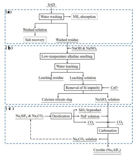 The procedure of cryolite synthesis in the current study contains three different steps as depicted in Figure 1: water-washing pretreatment of SAD (a); extraction of Al component via pyro-hydrometallurgical process (b); carbonation (c).