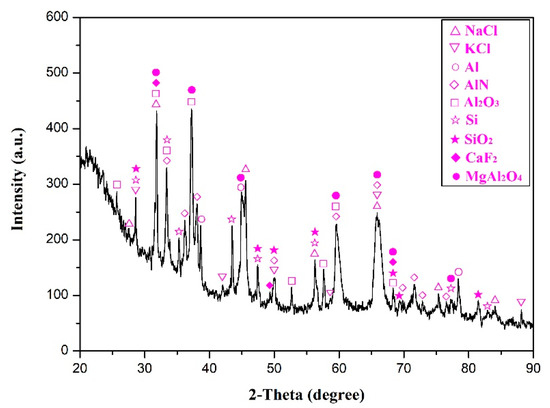 Table 1 presents the chemical composition of the as-received SAD. It can be seen that, nearly 75 wt.% of the as-received SAD consisted of Al and O elements, and the rest of them were composed of salts constituents like Na, K, F, and Cl, and other alloying elements (Mg, Si, Ca, Fe, Ti, Mn, Cu, etc.,). In addition, the as-received SAD also contained some trace elements with content below 0.10 wt.% such as S, Cr, Sr, Zn, and Hg. The corresponding XRD pattern of the as-received SAD is depicted in Figure 2. According to the diffraction peaks, it can be confirmed that the as-received SAD was mainly constituted of nine crystalline phases: sodium chloride (NaCl), potassium chloride (KCl), pure aluminum (Al), aluminum nitride (AlN), corundum (Al2O3), silicon (Si), silica (SiO2), calcium fluoride (CaF2), and spinel (MgAl2O4). It is worth mentioning that certain other phases containing the elements as shown in Table 1 were not detected by XRD, which is attributed to the fact that they may be in an amorphous state or exist as crystalline substances but in very low amounts [8,28].