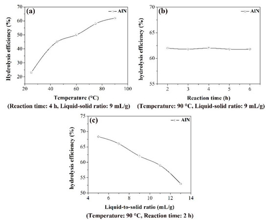 Effects of temperature (a), reaction time (b), and liquid-to-solid ratio (c) on the hydrolysis efficiency of AlN.