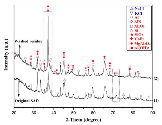 Under the optimal water-washing conditions mentioned above, 100 g of SAD was subjected to the washing process. Figure 4 shows the XRD patterns of the SAD before and after water washing. As compared to the original SAD, the peaks of Al, AlN, Al2O3, Si, SiO2, CaF2, and MgAl2O4 remained in the XRD pattern of washed residue while the peaks of soluble salts like NaCl and KCl disappeared. Thus, it may be concluded that both NaCl and KCl have been effectively removed by the water-washing of the SAD. In addition, another major phase of Al(OH)3 in the washed residue was also detected, which was derived from the hydrolysis process of AlN in the SAD. As seen from the areas marked by blue dotted squares in Figure 4, the peak intensity of the AlN was remarkably weakened after the water washing of the SAD, due to the hydrolyzing depletion of AlN. As for the obtained washed solution, it was evaporated to get the mixed NaCl and KCl crystals. As expected, it would be economically beneficial to reuse the recovered salts in the secondary aluminum smelter.