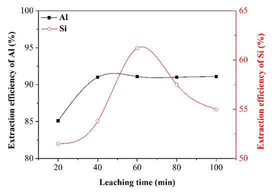 Effect of leaching time on the extraction efficiency of Al and Si.