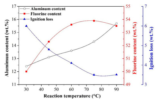 Effect of reaction temperature on the aluminum content, fluorine content, and ignition loss of synthetic cryolite.