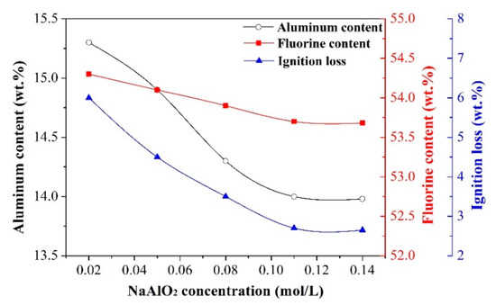 It can be clearly seen from Figure 11 that the aluminum content, fluorine content, and ignition loss of synthetic cryolite were decreased first and then kept unchanged with the NaAlO2 concentration increasing. It is worthy to mention that the falling trend of the aluminum content was more significant than that of the fluorine content. A possible explanation for this phenomenon is that, the increasing of Na+ ion concentration can promote the transformation of NaAlF4 into Na3AlF6 according to the reaction [34]: